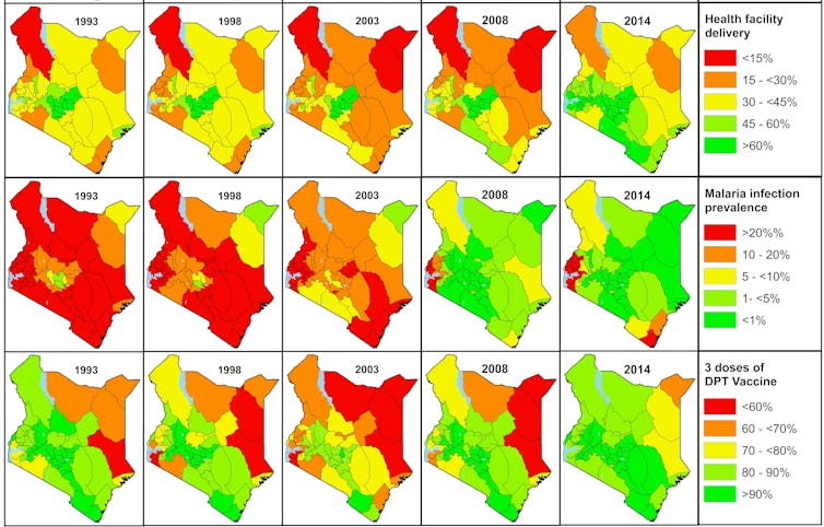 While Kenya had 43 deaths per 1,000 live births in 2019, our previous work showed big differences across the 47 counties since 1965. A range of factors were likely behind this. These included disparity in the coverage of interventions such as the uptake of childhood immunisations, supplements and breastfeeding practices. Other important factors include pregnant women attending antenatal care, having skilled birth attendants and delivering their babies in a healthcare facility.